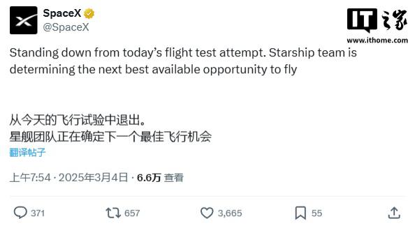 IT 世家 3 月 4 日消息,SpaceX 星舰(Starship)第八次试飞任务(IFT-最初的发射窗口期是北京时间 3 月 4 日早晨 7:30 打开,但是倒计时 40 秒宣布暂停检查,随后官方宣布因未知原因撤销发射,并未公布新发射窗口期。