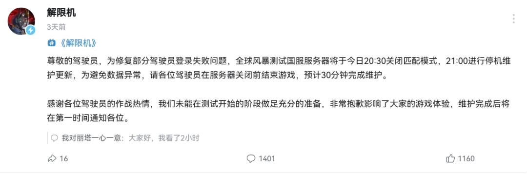 二月二十三日,西山居机甲战斗新游《解限机》在Steam上开启了新一轮Demo测试,当天最高在线人数一度达到31万,Twitch第一天观看时间达到27万小时,登上分类推荐名单,在玩家群中 热度很高。