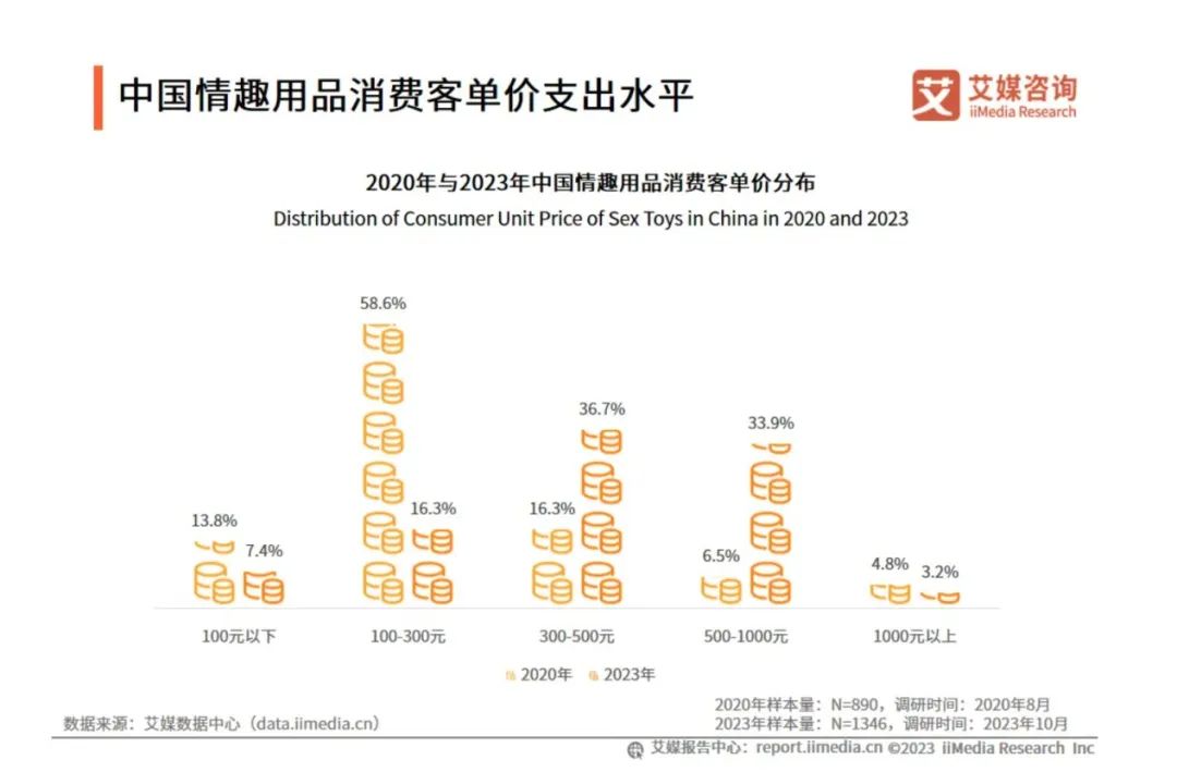 我们可以参考我国情趣用品消费的客单价,根据艾媒咨询的《2023—2024年中国情趣用品行业及消费行为调查分析报告》显示,2020年中国情趣用品消费客单价主要集中在100-300元,2023年则主要集中在300-1000元。尽管客单价上涨明显,可我们看到,1000元以上的消费区间反而是下降的。