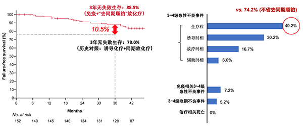 研究结果显示,采用上述新疗法可使患者的3年无失败生存高达88.5%,相较于既往“诱导化疗后同期放化疗”的历史参照值显著提高了10.5%。不仅如此,这个新方案还使严重急性毒性发生率降低至40.2%,相较既往下降了近一半,其中放疗时严重急性毒性发生率仅为16.7%。