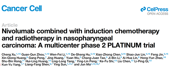 2月28日,中国科学院院士、中山大学肿瘤防治中心马骏教授、孙颖教授团队在国际顶尖肿瘤学期刊《癌症细胞》(Cancer Cell)发表了一项鼻咽癌临床研究新成果。团队以“纳武利尤单抗联合诱导化疗和单纯放疗治疗鼻咽癌:一项多中心2期试验”为题,首次在局晚期鼻咽癌中创立了免疫治疗联合“去同期顺铂”放化疗的新方案。
