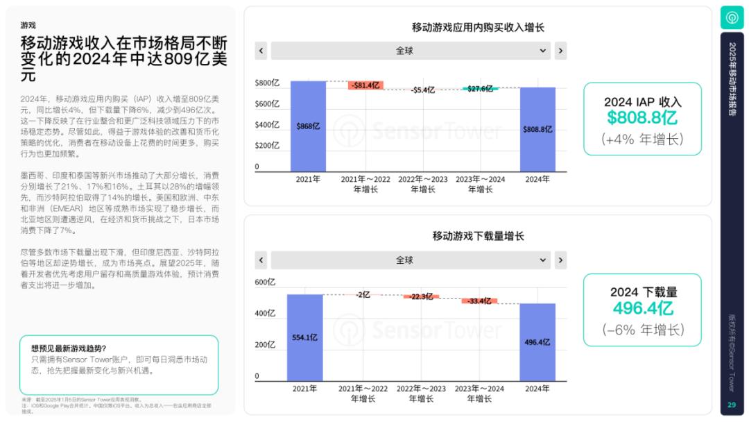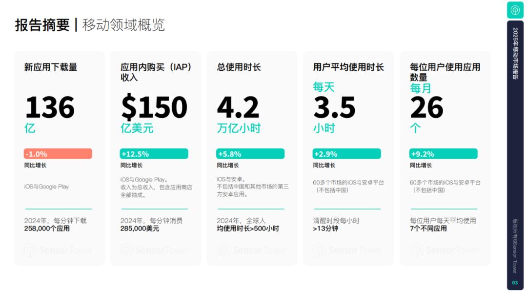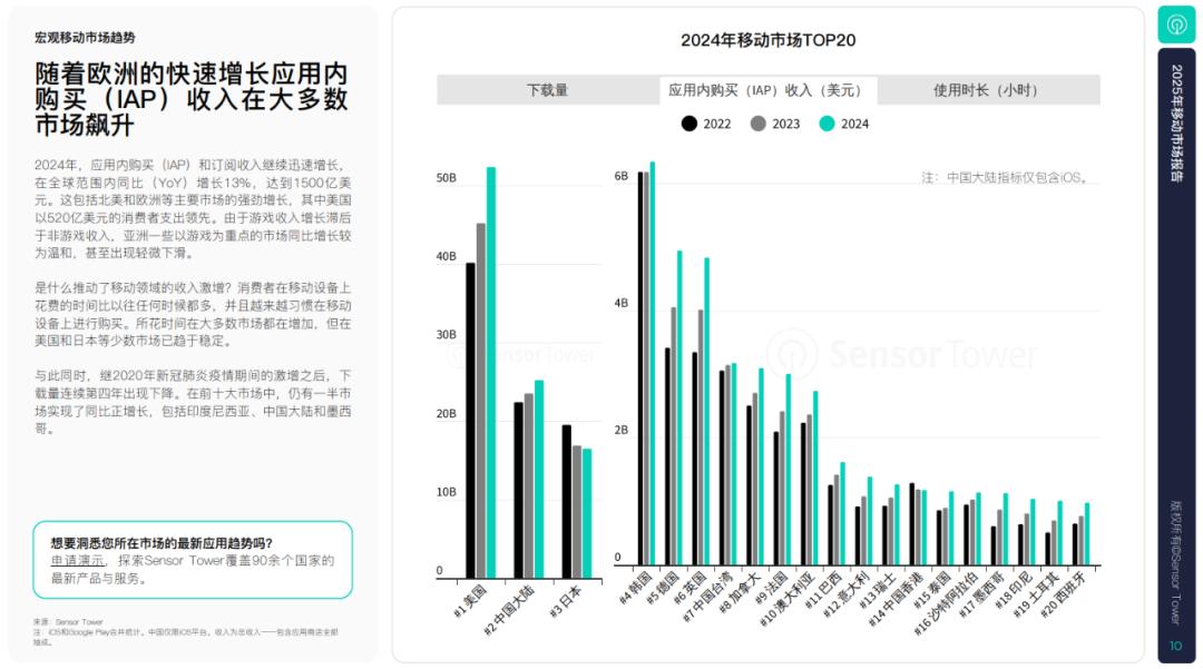随着我们进入2025年,移动市场变得比以往任何时候都更加强大,复苏中的移动游戏市场为非游戏领域的快速增长锦上添花。Sensor 根据Tower的《2025年移动市场报告》,移动领域的变现速度正在加快。2024年,iOS和Google 在全球应用程序中购买Play(IAP)自2021年以来,收入首次达到1500亿美元(同比增长13%),这是最高的一年。这些包括在应用程序中购买,订阅,付费应用程序和游戏消费。