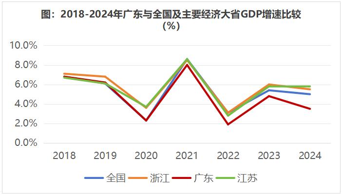 大家看图片,自2020年以来,广东的经济增长率不仅低于全国,而且低于江苏、浙江等兄弟省份。而且,这一差距有扩大的趋势。2021-2024年,广东各自低于全国0.6、1.1、0.6和1.5%,各自低于江苏0.6、0.9、1.0、2.3%,低于浙江0.5、1.2、1.2和2%。