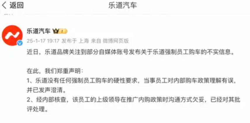 1月,网上流传的聊天记录显示,乐道汽车硬性要求每位销售人员购买乐道L60,半年后回收。乐道官方对此进行了辟谣,确实是一线销售人员的福利。乐道副总裁庆华说:“问题来自于温州一位乐道经理在沟通时过于生硬的方式,对他进行了严厉的批评”。