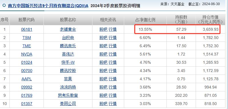 老铺黄金在2024年6月底公布的持仓明细中,成为中国新兴经济基金在南方占比最高的成份股。