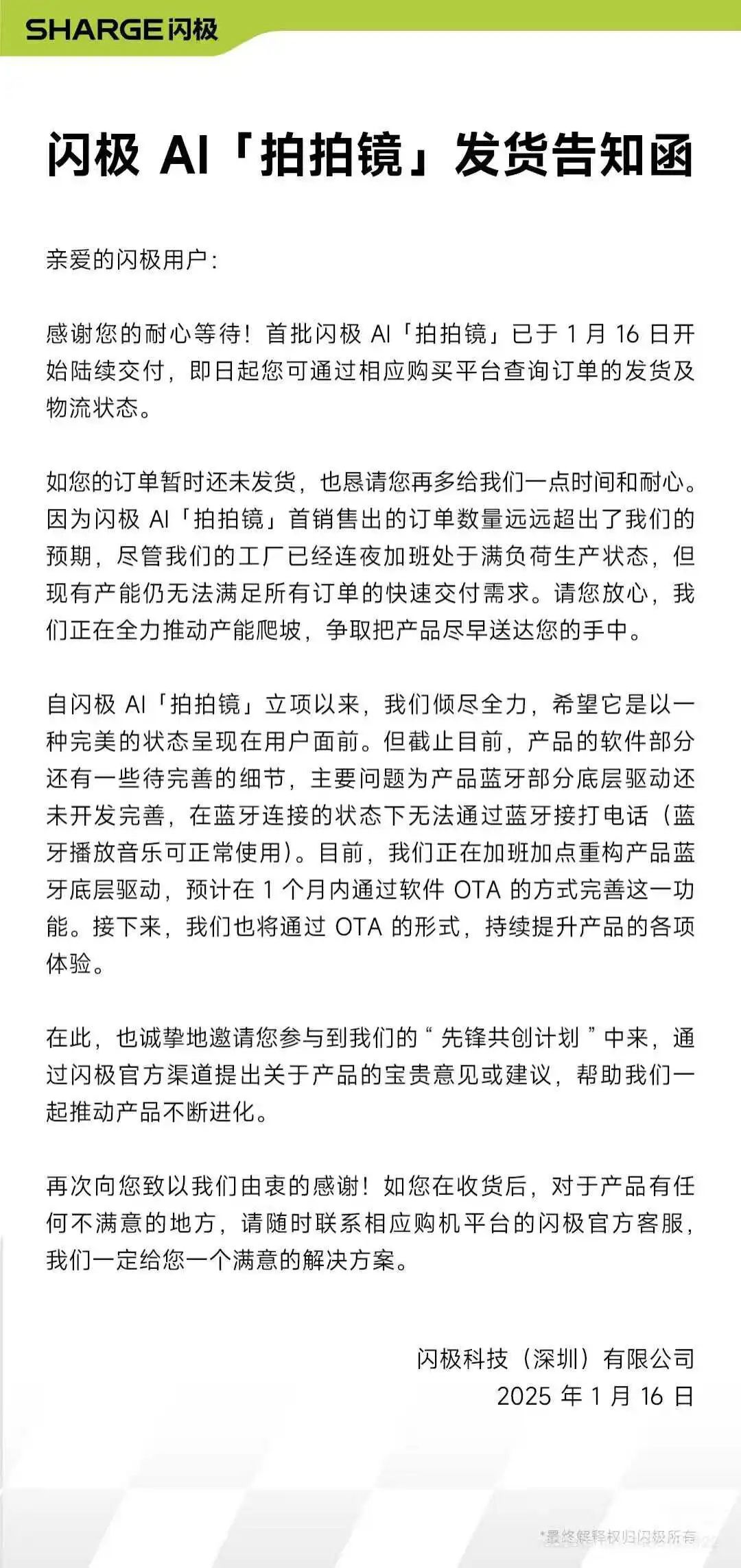 与此同时,闪极曾于1月16日致电部分用户,讲述耳机蓝牙的修复问题,预计需要一周时间。