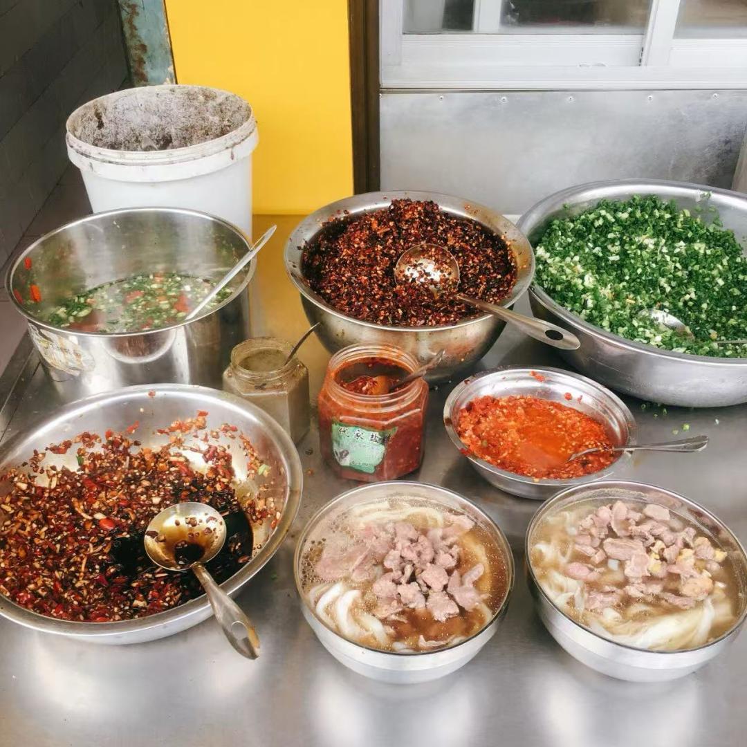 尽管叫素粉,调料却一点也不“素”——肉沫、脆哨(长时间文火炸至酥脆的猪肉粒)、可以选择各种口味的肉末,如辣子鸡丁、红烧肉块等。,加入酸萝卜粒、葱花、油炸花生,加入酱油、香醋、辣椒粉等调料。