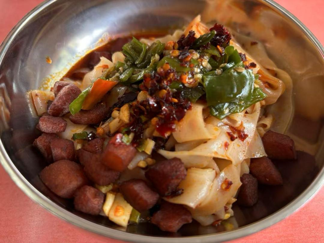 除了酸汤,素粉(指碗里没有大块肉的米粉)在黔东南也很受欢迎,这次流行的殡仪馆粉可以算是素粉。在贵州,素粉可以做得很好。贵阳的红油素粉是早餐摊的热门选择。白色的米粉舀上一勺红色的辣椒红油,香气四溢,艳丽的色彩立刻让人口舌生津。
