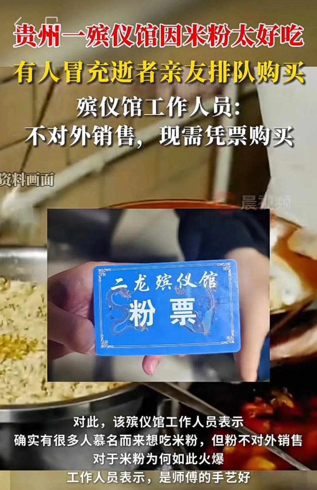贵州凯里的二龙殡仪馆出人意料地因为米粉好吃而走红。因为殡仪馆的食堂不对外开放,甚至一些来这里的食客假冒死者家属排队购买,殡仪馆开始限制购买票。