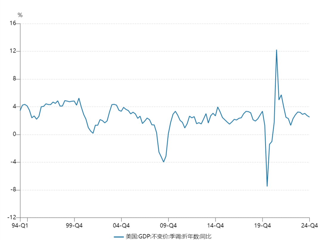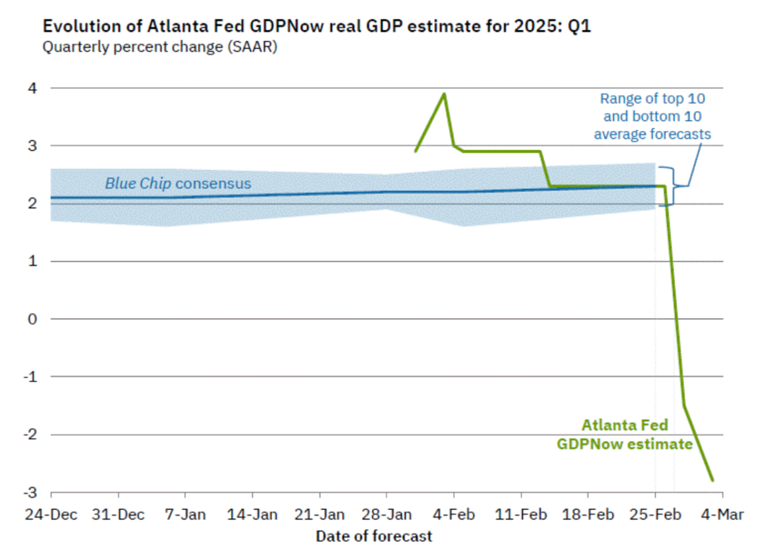 亚特兰大联储当地时间3月3日的GDPNow模型预测,2025年第一季度美国GDP将萎缩2.825%,这是自2020年新冠肺炎疫情以来最糟糕的美国GDP预测。