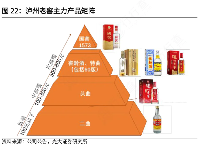 就价格而言,泸州老窖股份有限公司的中高端产品包括国窖1573、泸州老窖特曲等(含税销售价格≥150元/瓶的酒)。事实上,国窖1573长期与茅台飞天、五粮液普五并列为中国高端白酒“三驾马车”,并与两者进行差异化竞争。