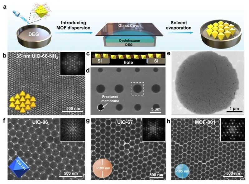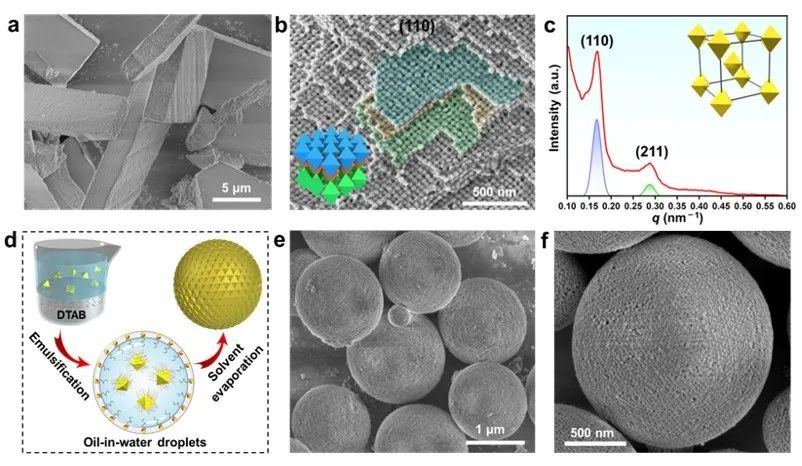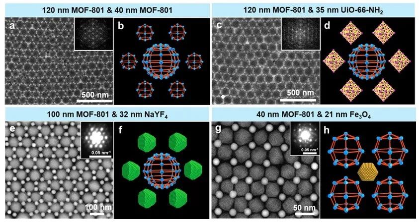 首先,采用通用的气体-液体界面组装方法,获得2DMOFs薄膜超晶格,具有长期有序和自支撑。随后,采用溶剂挥发法和乳液限域组装法,获得了一系列结构和成分不同的3DMOFs超晶格和MOFs超颗粒材料。最终,通过将不同的MOFs纳米晶或传统纳米晶结合起来,获得了各种结构可调的二元MOFs基超晶格。