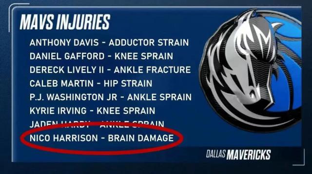 随后,著名美国媒体发布了一张照片,记录了本赛季独行侠球员的受伤情况。图中有八人名单。安东尼 - 戴维斯(腹股沟)、凯里 - 欧文(膝盖骨)、丹尼尔 - 加福德(膝盖骨)、莱夫利二世(踝关节)、凯勒布 - 臀部(臀部)马丁、PJ 华盛顿(踝关节)、杰登 - 哈迪(踝关节)。