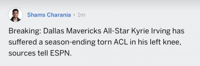 据 nba “爆料大王” Shams Charania 透露,已确认欧文左膝受伤。 ACL(十字韧带撕裂)伤病,赛季报销。