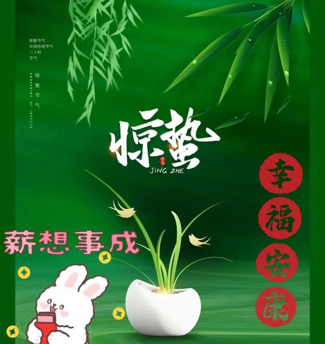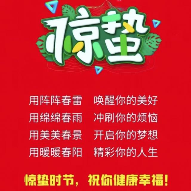 隆隆的雷声把耳朵吵醒,听着春天的快乐;细雨把眼睛吵醒,数着春天的快乐;柔和的微风把感觉吵醒,品尝春天的美好;蛰,气,愿你走进大自然,享受春天的快乐和快乐!