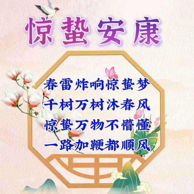惊蛰,阳光罩,春光迷人;春雷响,天空变暖,春暖花开万物苏;谈天地,去郊游,欣赏春天的美好魅力;问候真相,祝你幸福健康。祝你惊蛰快乐!