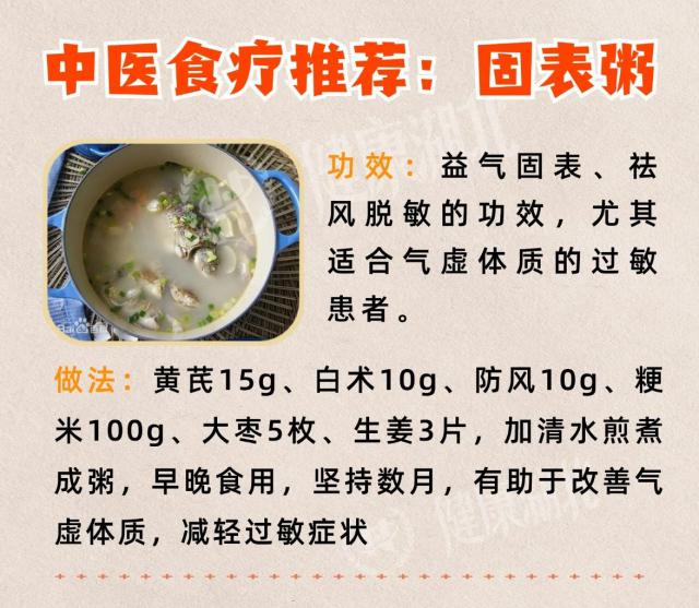 固表粥:黄芪、白术、抗风熬粥,适用于气虚易过敏的人群。