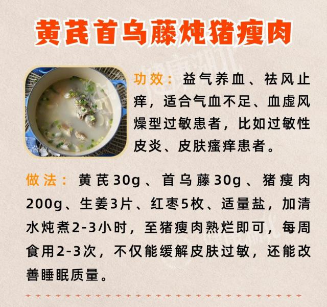黄芪首乌藤炖瘦肉:补气止痒,适用于皮肤干燥、睡眠不佳的人群。
