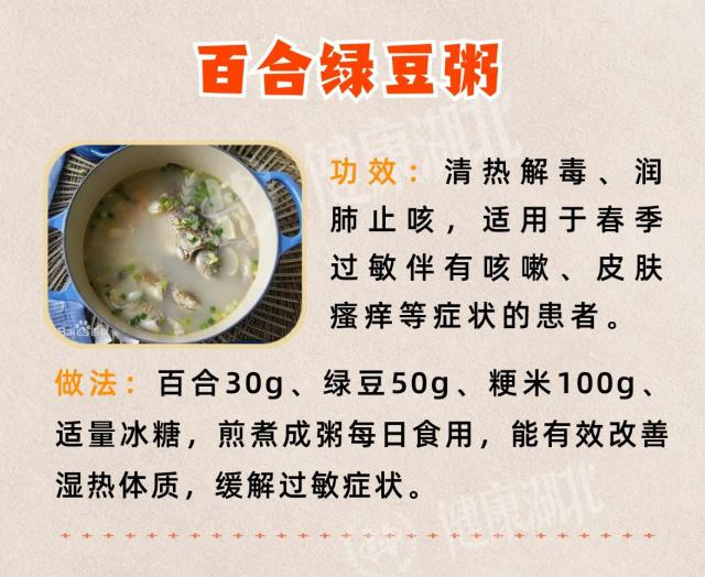 百合绿豆粥:清热除火,适用于皮肤瘙痒、咳嗽的人群。