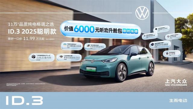3 月 3 日本,新款上汽大众 ID.3 正式上市,共同推出 3 一辆车,限时一口价 11.9888 万 -13.6888 一万元,指导价格区间为 12.9888 万 -14.7888 另外,从现在开始到现在 2025 年 4 月 30 日期,将限时免费送价值。 6000 元听劝升舱包。
