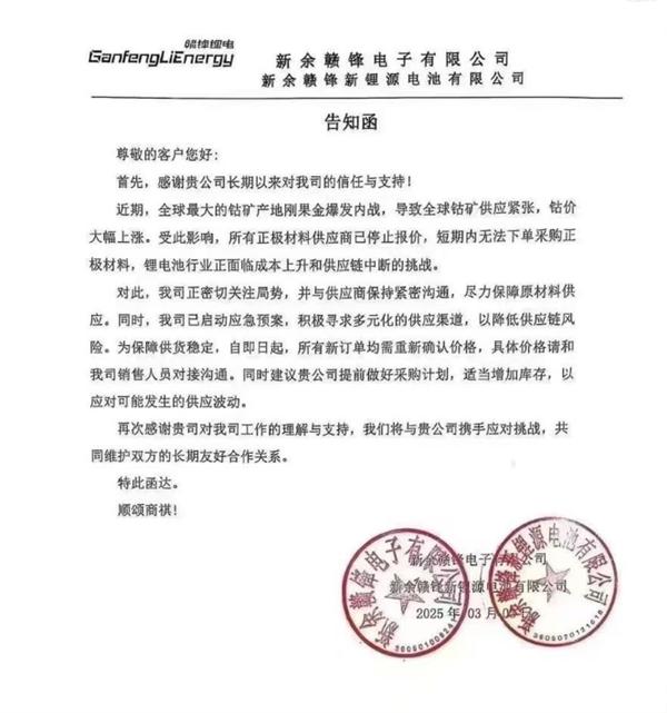 快科技 3 月 5 日前,国内动力电池制造商赣锋锂电池发布客户通知函称: