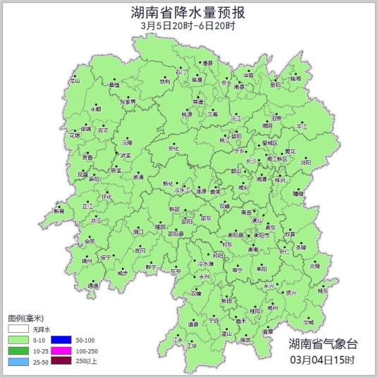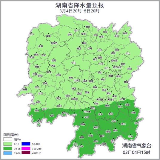 五日白天,阴天有小雨,湘南部分地区中雨,湘西北高海拔地区有雨夹雪或冻雨;北风2~三级;湘中至北最低温度2~4℃,其他地区4℃~6℃;最高温度5~9℃。