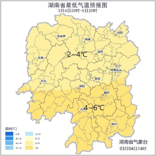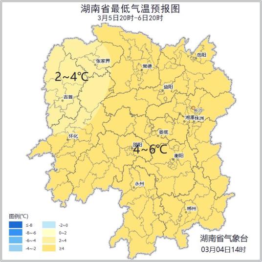 五日晚至六日白天,阴天有小雨,湘西北高海拔地区有雨夹雪或雪;北风3~4级,局部阵风6级;湘西北2级最低温度~4℃,其他地区4℃~6℃;湘西9的最高温度~11℃,其他地区12℃~14℃。