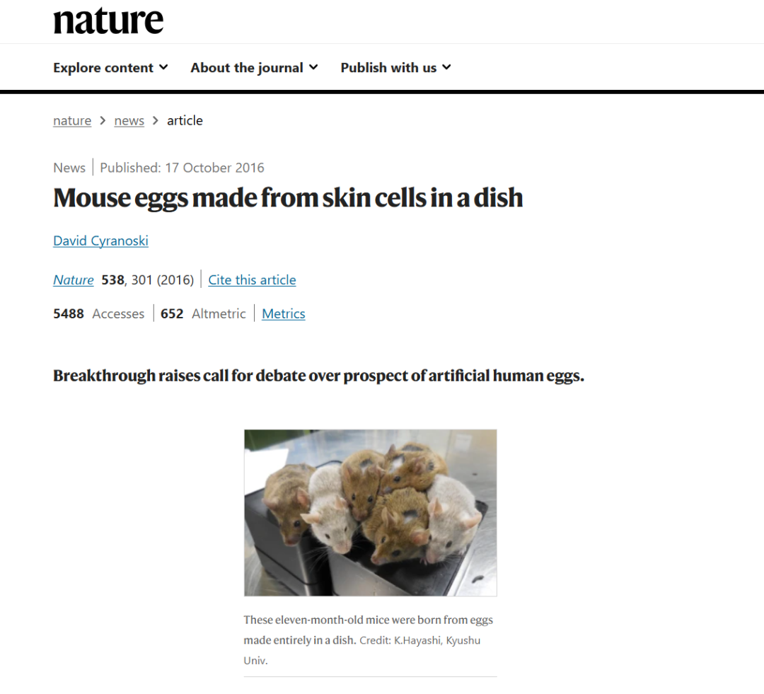 2016年,日本生殖生物学家林克彦及其导师斋藤通纪将鼠尾切割的细胞诱导成干细胞,引导这些细胞发育成卵子,首次将鼠皮细胞在体外转化为受精卵。