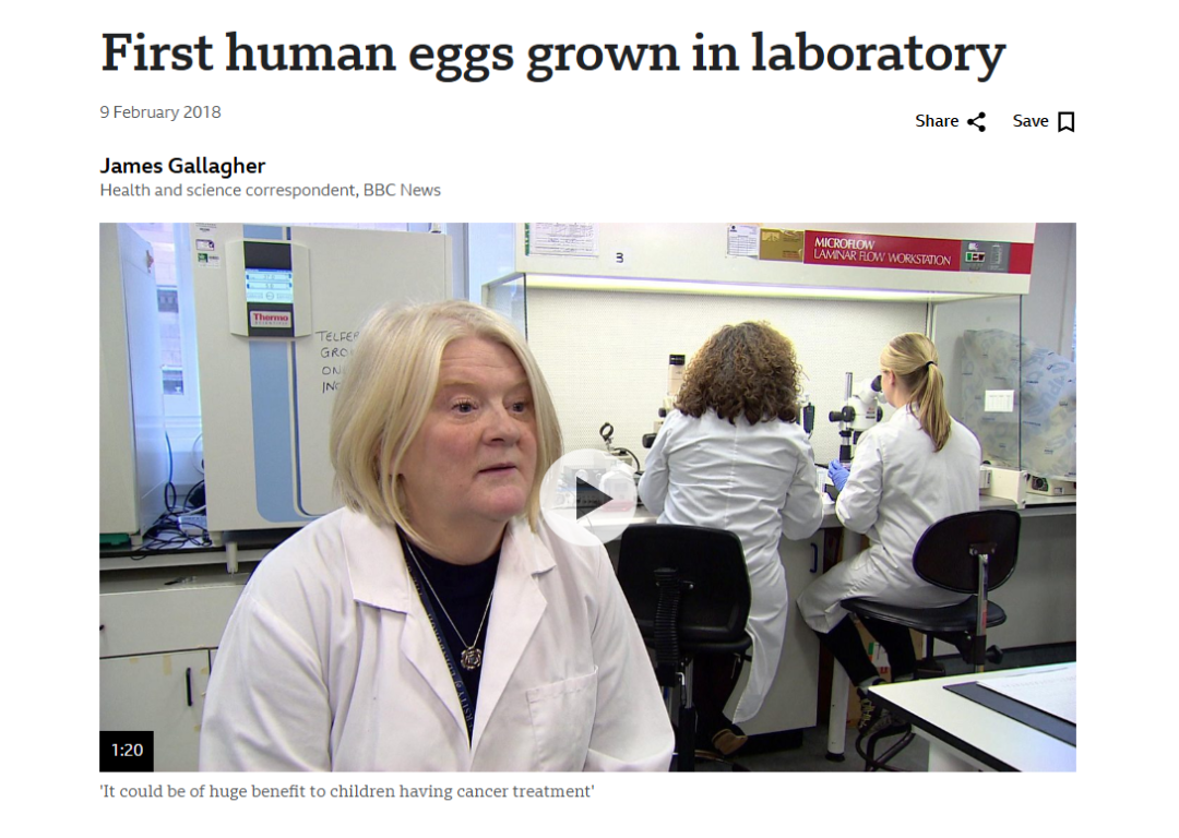 爱丁堡大学生殖生物学家伊芙琳·特尔弗2018年(Evelyn Telfer)同事们宣布,在实验室成功地将人类未成熟的卵子培育成完全成熟的卵子,而且只用了22天,这是人们第一次。