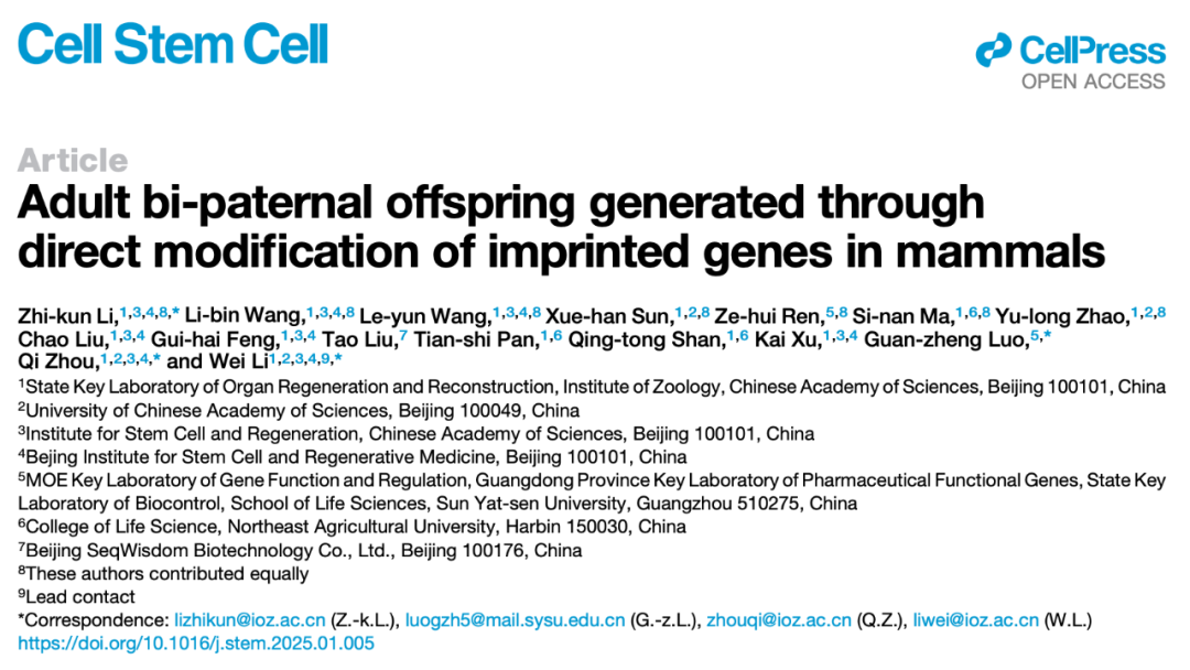 2025年1月28日,中国科学院动物研究所李治邈、李伟、周琪、中山大学骆观作为共同通讯的作者, Cell杂志子刊 Cell Stem Cell 上面发表了一篇研究论文,探索了双父本小鼠胚胎中可能导致小鼠死亡的印记区域。研究小组通过引入移码突变、基因缺失和控制区域的关键印记位点进行编辑,制定了有效减少双父本胚胎最严重发育缺陷的策略,并结合各种技术,最终成功培育出能够完全成年的双父本老鼠(孤独的老鼠)。