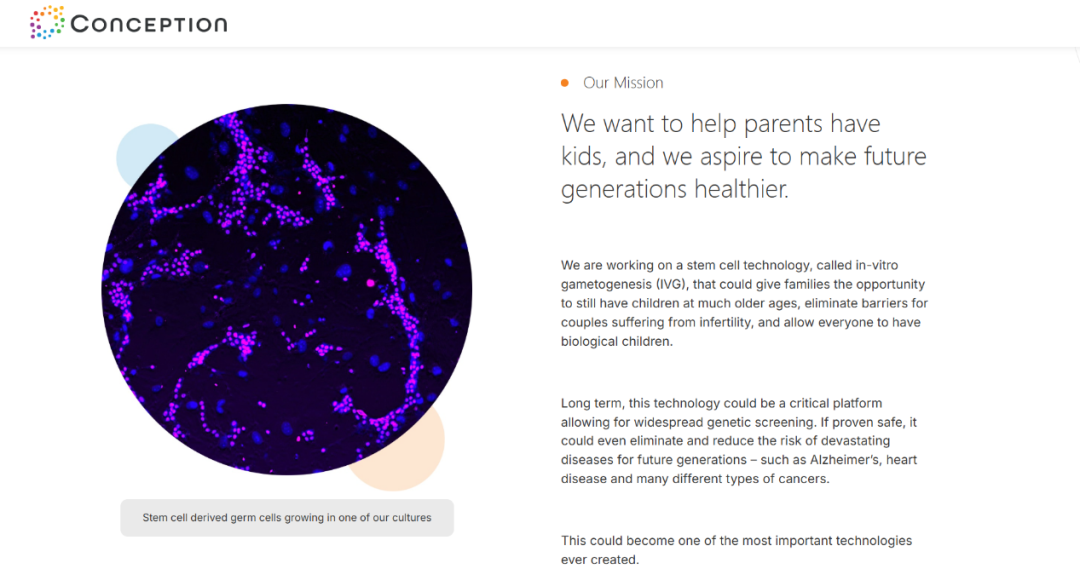 Conception是一家由奥尔特曼的前男友克里斯洛夫参与成立的生物技术公司。该公司致力于通过体外配子产生(IVG,辅助生殖技术又称辅助生殖技术,将一种叫做诱导性多能干细胞的干细胞转化为人类卵子,从而帮助失去卵子或未能带来健康卵子的妇女、同性伴侣或跨性别者实现遗传联系的妊娠。