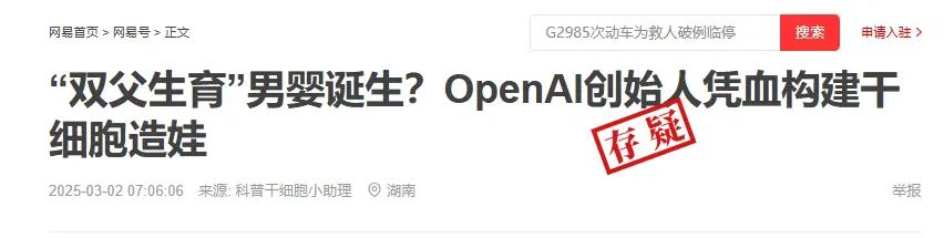 - 网爆“OpenAI 没有证据表明CEO奥尔特曼利用Conception公司的技术实现了世界上第一个双父生育。相关公司没有公开经典案例,也没有在科学期刊上公布任何研究结果或实验细节。
