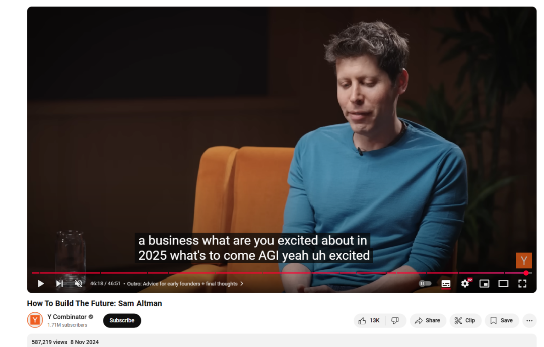 奥尔特曼于2024年11月参加Y 播客节目的Combinator视频截图。