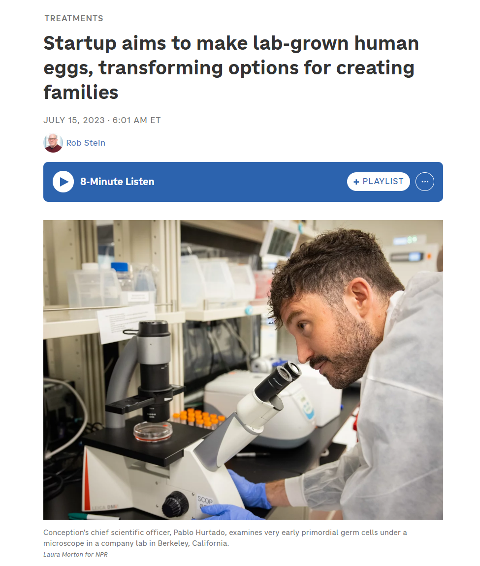2023年7月,美国国家公共广播电台(NPR)报告了Conception的创业团队。据报道,Conception公司声称,他们已经能够在微型卵巢中产生人类卵子,他们希望这些卵子能够将未成熟的卵子发育成胚胎和婴儿的受精卵子。