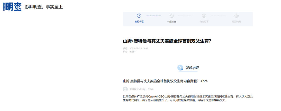 最近,有读者在澎湃明查网站上(factpaper.cn)发起确认,询问“OpenAI 利用生物技术,CEO萨姆·奥尔特曼和他的丈夫实现了世界上第一次双父生育。