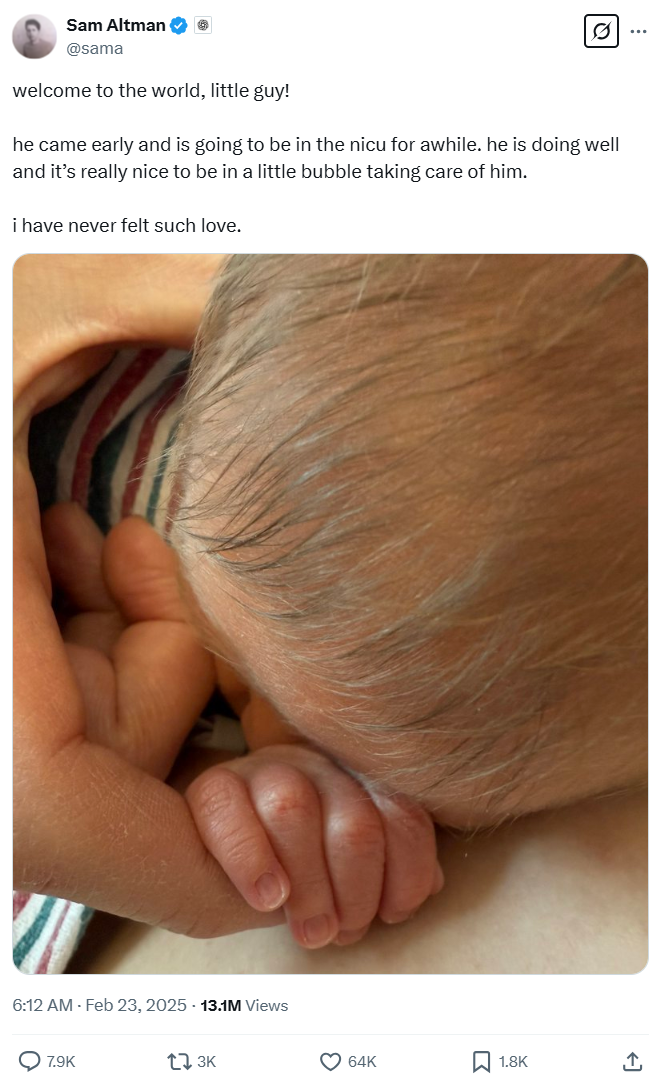 二月二十三日,奥尔特曼在社交平台X(原推特)上宣布要孩子,并附上一张新生儿的照片。
