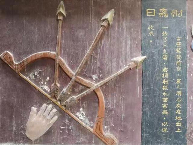 第三,选择图符作为驱虫的象征。例如湖南恩施和鄂西土家族有传统节日“射虫日”,在惊蛰前一天举行。土家人认为,每年蛰伏的时候,冬天蛰伏的各种害虫都会复活,危害庄稼。因此,在蛰伏前夕,他们首先用炭灰在地上画出弩的形状,这意味着“射杀所有害虫”,避免昆虫灾害,以获得丰收。另外,通过剪纸、贴纸、画葫芦等贴纸来驱除虫蚁,也是非常常见的。比如辽宁兴城,女性会在“2月2日”和“刺痛日”前后剪红纸作为剪刀贴在墙上,也就是引龙驱虫的意思;在山西东南地区,人们习惯于在屋壁上画葫芦,以避免昆虫;在山西乡宁,每个人都会厌倦蝎子;在上海,每个人都会去蛇王庙请蛇王符。