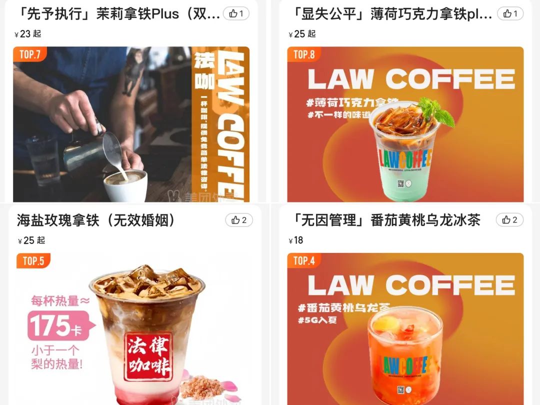 贵阳LAW COFFEE的产品名称也很有意思。比如海盐玫瑰拿铁叫“无效婚姻”,麦芽拿铁叫“监外执行”,草莓奶盖茉莉冰茶叫“资产交易”,草莓椰子拿铁叫“诉状”。