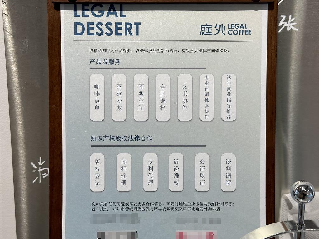 “咖啡、茶歇、版权、商标、维权/律师合作、证据保全”也清晰地标注在门上,多元化业务直观呈现。旁边的灯箱上写着“一家合法的咖啡店”,也很适合这个场合。