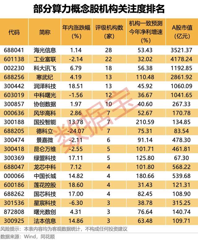 在这些机构中,海光信息、工业富联都有20多个评级,科大讯飞、寒武纪-U、润泽技术、中科曙光等都有超过10个机构评级。