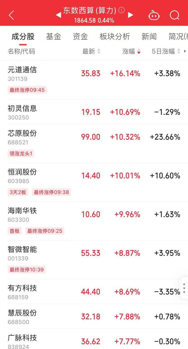 开盘部分算率产业链个股涨幅抢眼,元道通信一度“20cm”涨停,恒润股份、海南华铁等涨停。