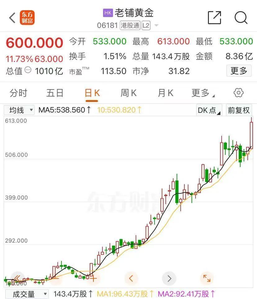 市场方面,3月5日,老铺金(61818).HK)开盘高开高走,下午超过600港元,涨幅超过14%,最终收于11.73%,总市值达到1010亿港元。
