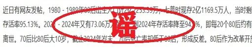 经过调查,网友“夏老师在上海”发布了“80后还剩多少人”的视频,编造了“80后剩余成活率降至94.8%(死亡率5.2%)”,成为后续一系列谣言信息的来源。