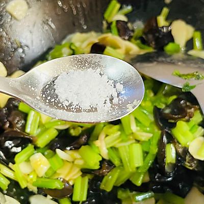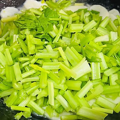 7、放入准备好的芹菜段,炒匀。