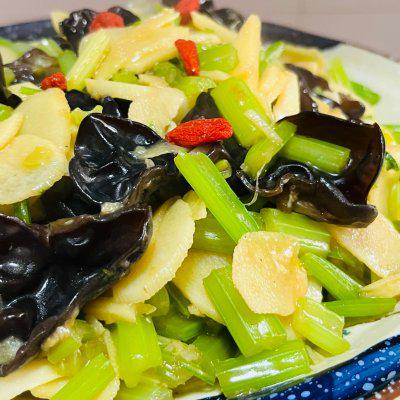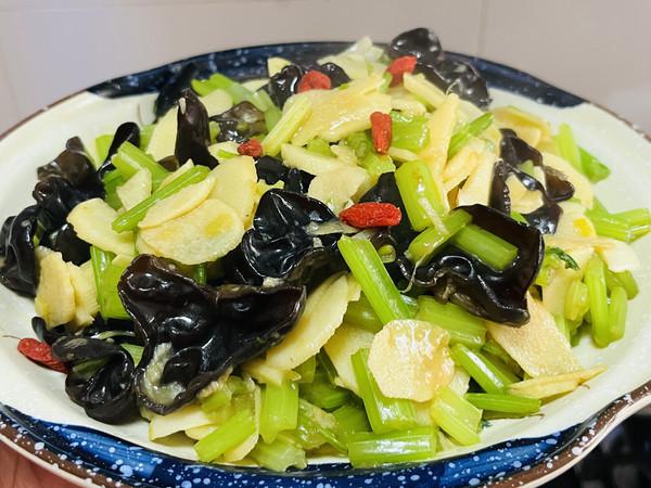 11、加入一些枸杞装饰,一种健康美味的山药炒芹菜呈现,请慢慢使用。