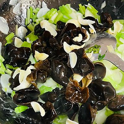 8、放入浸泡好的木耳和百合,炒匀。