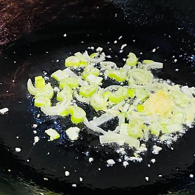 4、热锅冷油,待油湿热后加入葱花蒜沫炒出香味。