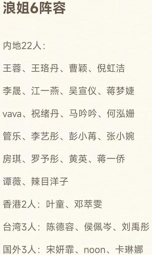 所以,浪姐 6还是如期而至,30 一位全新的姐姐加入,依然汇集了大前辈、演员、歌星、跨界姐姐,阵容上颇具第一季阵容的视觉感。