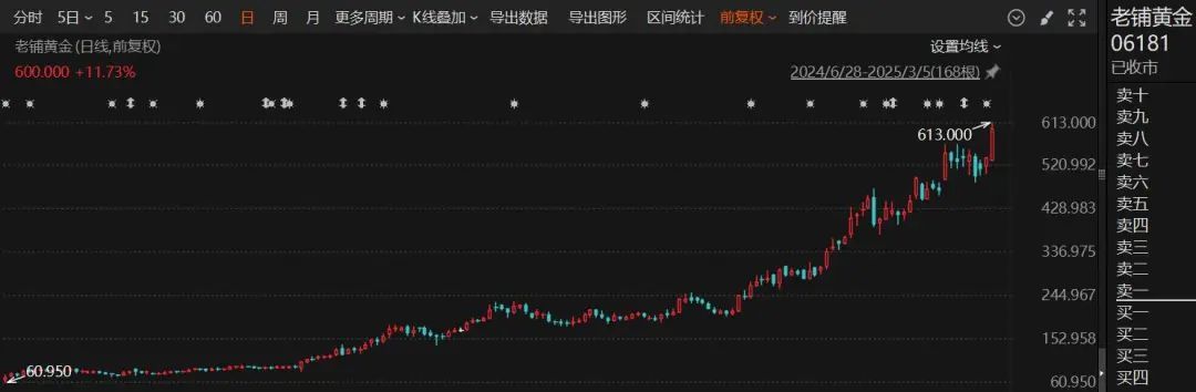 有港股“最贵黄金股”之称的老铺黄金(06181.HK),3月5日,股价再次大幅上涨,盘中一度涨至613港元,创下上市以来的最高纪录,收盘价上涨11.73%至600港元。老铺黄金今年股价走势惊人,先后超越了腾讯控股和携程集团这两个曾经的“股王”,现在已经稳居港股市场“股价一哥”的宝座。