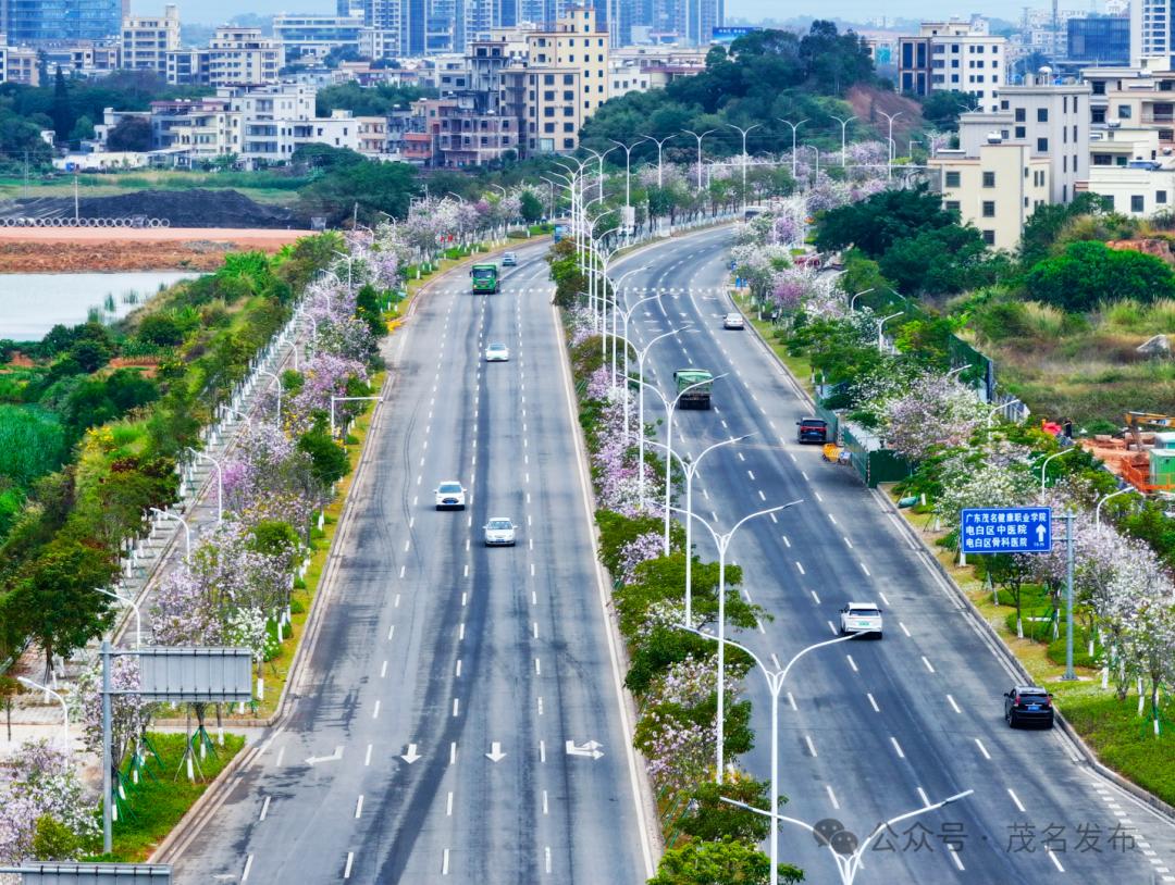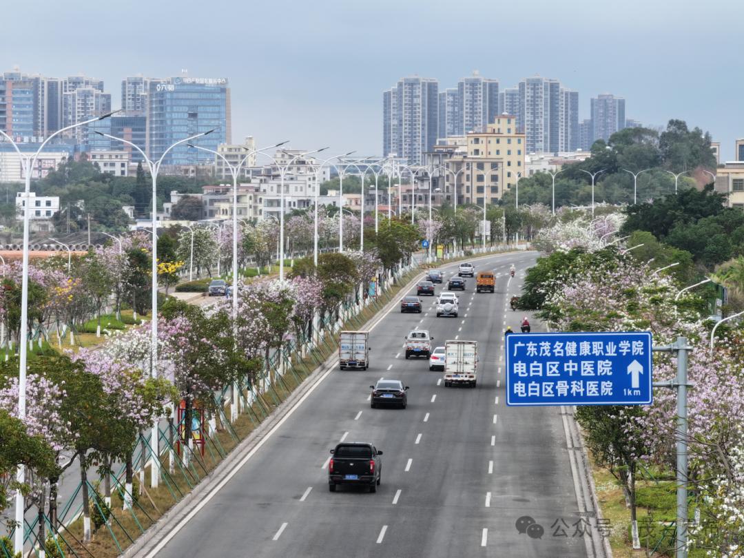 包茂大道的转型并不孤单。电白区对21条主干道进行了全方位绿化升级,打造了“宽、畅、净、亮、美、绿”的城市门户形象。海堤路上的蓝花楹浪漫碧道,海滨大道上的勒杜鹃旅游线路,迎宾大道上的“城市印记,滨海魅力”、大道上的“城市森林”……每一条道路都被赋予了独特的主题,成为连接城镇的“生态颈链”。